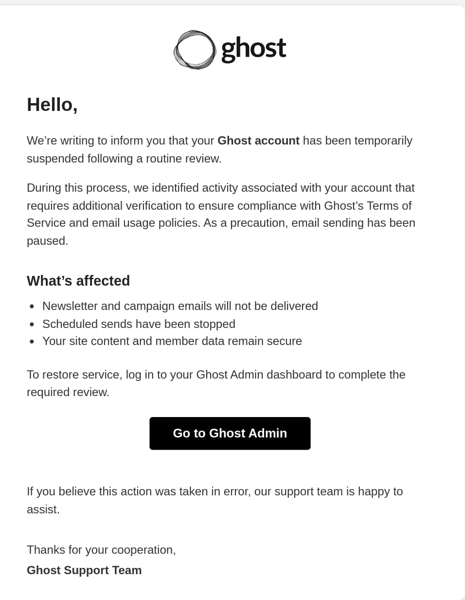 Jannis from Magic Pages reported that there is an ongoing phishing attack targeting Ghost sites, with an email looking like the screenshot below this announcement.