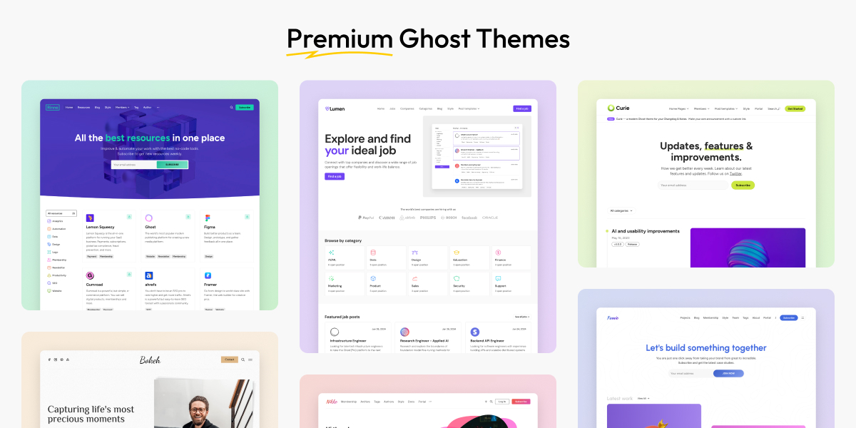 Ghost themes for creators, publishers and businesses. Create your next blog, newsletter, directory, photography or news website with Premium Ghost themes.